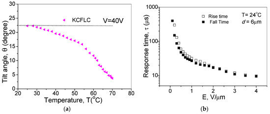 (a) Temperature-dependent molecular tilt angle (θ) and (b) the electric field-dependent response time (τ) for the KCFLC 10R sample in a planar aligned cell with cell thickness of 6 μm. The measurement was performed at 24 °C.