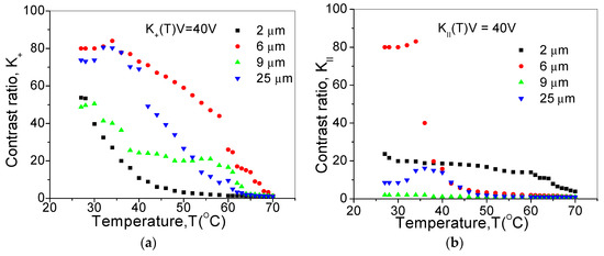 Temperature dependent contrast ratio of SmC* phase (K) in (a) crossed and (b) parallel polarized states. Measurements are carried out by the application of 40 V in planar-aligned cells filled with KCFLC 10R material, in a cooling process.