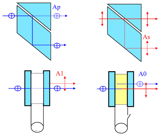The principle of operation is that the birefringent plate at the input port manipulates the polarization states to the desired ones. The most important element in the binary switch is FLC, in conjunction with the lateral beam splitters (LBS). In the absence of the electric field, the input signal passes through the FLC cell and polarization beam splitter with the same polarization. The schematics of optical switching through the FLC cell and the LBS are shown in Figure 4.