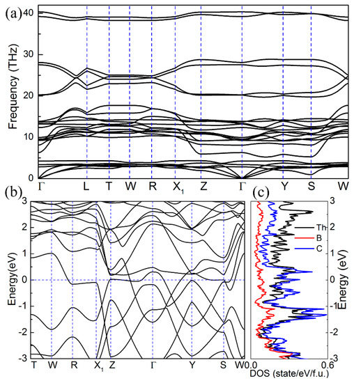 where represents the total energy of ThBC2, and , , and denote the total energies of bulk thorium, α-boron, and graphite, respectively. The calculated formation energy of ThBC2 is −1.454 eV/f.u., suggesting the thermodynamic stability and possible synthesis of ThBC2 in experiment. In addition, the electronic band structure calculation reveals that ThBC2 is metallic, as shown in Figure 2b,c. The density of states (DOS) for ThBC2 implies that the Th and C atoms mainly contribute to the total density of states around the Fermi level.