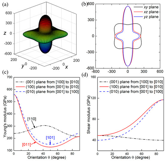 3D plots of Young’s modulus (a) and its plane projections (b) as the function of the directions, in which the distances between the origin and the surface are the values of Young’s moduli along corresponding directions. Orientation dependence of Young’s modulus (c) and shear modulus (d), in which the principal crystal orientations [110], [101], and [011] are marked by arrows with different color.