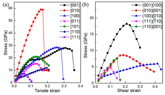 The stress as the function of tensile (a) and shear (b) strains along different tensile and shear strain directions.
