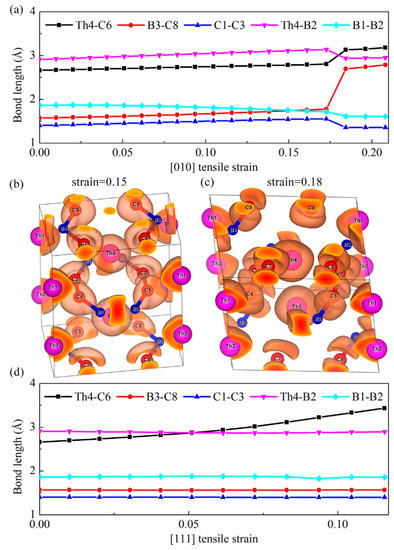 Interestingly, the strain–stress curves under tensile and shear deformation exhibit different characteristic along various directions. For instance, the stress along the [010] direction drops abruptly under tensile deformation, while along the [111] direction the stress decreases gradually rather than a sharp decrease past the elastic limit. To get deeper insights into this interesting characteristic, we next analyze atomic bondings and electron localization function (ELF) to clarify this point. Figure 5a shows the bond lengths of our chosen typical Th-C, B–C, C–C, Th-B, and B–B bonds as a function of the [010] tensile strain. Clearly, we can see that the distance between the B3 and C8 atoms increases abruptly when the tensile strain exceeds the critical value of 0.17, while other bonds show small changes compared with the B–C bonds. Therefore, the alignment of strong covalent B–C bonds along the [010] direction is the main load bearing component, which leads to the largest ideal tensile strength 59 GPa. Nevertheless, once the tensile strain is larger than the critical value of 0.17, as show in Figure 4, a sudden ‘‘hard’’ breaking of the strong covalent B–C bonds occurs, which accounts for the sharp decrease of the stress along this direction. To further confirm this bond-breaking pattern, the three-dimensional isosurfaces of ELF with an isovalue of 0.75 before and after the critical tensile strains are plotted in Figure 5b,c. Generally, the large ELF value corresponds to high electron localization and is the characterization of covalent bondings. As shown in Figure 5b,c, the charge distribution localized in between B3–C8 bond exhibits a sharp decrease when the tensile strain changes from 0.15 to 0.18, further suggesting the bond-breaking of strong covalent B–C bond under the [010] tensile deformation. However, for the [111] tensile deformation, as shown in Figure 5d, the bond lengths of B–C, C–C, Th-B, and B–B bonds nearly keep invariant with the increase of tensile strain, while the Th-C bond increases gradually as the tensile loading increases, even though beyond the critical strain 0.06. Therefore, the stress under this tensile mode change gradually beyond the critical strain, corresponding to the softer bond-deformation behavior. In a word, the ‘hard’’ breaking of B–C bonds correspond to the sharp decrease of the stress in the strain–stress curve, while the weak Th-C bonds result in softer bond-deformation behavior as characterized by a gradual decrease of the stress.