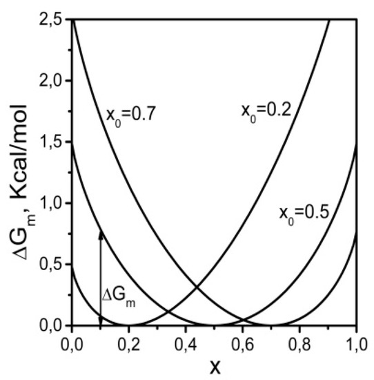 The change of free energy ΔGm calculated by Equation (1) when the composition of the solid phase x deviates from the equilibrium value x0 for InxGa1−xAs solid solution (T0 = 800 °C, β = 3.45 Kcal/mol [2]).