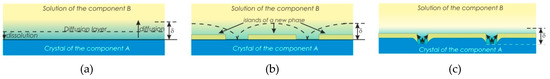 Finally, one can divide the whole process into three stages (Figure 4): (a) the primary dissolution of the substrate and formation of supersaturated solution boundary layer, (b) precipitation and fast growth of islands, and (c) further slow growth of islands combined with substrate dissolution between them.