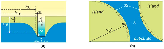 Let’s consider the material balance of the process. If the channel depth between the islands increases by dh as a result of dissolution, then the crystalline phase volume Sdh enters the solution that leads to an additional solution supersaturation. This results in the crystallization of the layer with a thickness of dr on the channel walls (Figure 5b), leading to a change in the free substrate surface area by −dS, while the volume of the crystallized phase is hdS. However, the compositions of the substrate and the crystallized layer are different; therefore, the coefficient ω is entered into the material balance equation, which takes into account changes in the volume and the solubility of the crystalline phase, depending on its composition changes. Then, the equation of material balance takes the form
