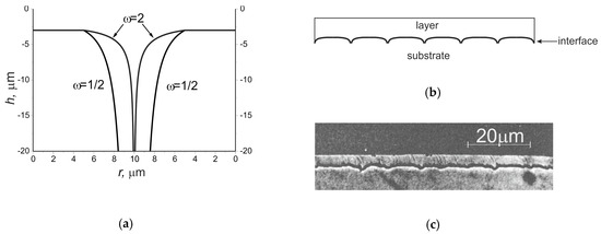 Figure 6a,b show the shape of the channels calculated for ω = 1/2 and ω = 2 and the layer-substrate interface for ω = 4 when p = 10000 mm−2, h0 = 3 μm and r0 = 5 μm. For comparison, Figure 6c shows a photograph of the cross section of the InAs/GaP epitaxial structure published in [1]. The similarity of the profiles in Figure 6b,c confirms the validity of the proposed mechanism.