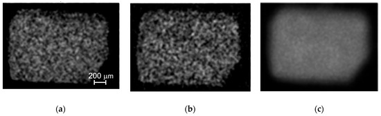 Figure 7a,b present Co and Ni distribution patterns. Figure 7c presents a summed image of Co and Ni distributions in the crystal obtained by superimposing the initial images (Figure 7a,b). The sum of the contents of the cobalt and nickel components in a solid solution should amount to 100% and, therefore, be constant. Figure 7 shows that the inhomogeneity of the summary image is much smaller than that of the initial ones, confirming the presence of mosaic microinhomogeneity of Co and Ni in the crystal. The characteristic size of the mosaic elements varies in the range of 70–200 μm.