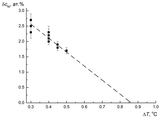 Our recent study [21] of KCNSH mixed crystals grown from solutions with a mass ratio of the isomorphic components KCSH:KNSH = 1:2 has shown a clear dependence of the value of micromosaic Ni inhomogeneity |δcNi| on the solution supercooling ΔT (Figure 8). Linear extrapolation to the value |δcNi| = 0 shows that a complete suppression of the mosaic inhomogeneity can be expected at ΔT = 0.8–0.9 °C.