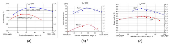 As it follows from Section 2.1 and Section 2.2, the interaction of mutual nonequilibrium phases starts with the crystal dissolution, which is the cause of subsequent epitaxial processes. However, the excess thermodynamic potential (1) of such a system can be compensated for by solution supercooling. In this case, the system acquires a metastable equilibrium, which prevents both the dissolution of the crystals and the growth of the new phase. This state was predicted theoretically and then confirmed by indirect data on semiconductor systems [2,3]. Later, such states were observed in situ in water-salt systems K2SO4-K2CrO4 [9], Ni(NH4)(SO4)2·7H2O-Co(NH4)(SO4)2·7H2O [12], KAP-RbAP [14] and KDP-ADP [15]. For the last three systems, critical supercooling was measured in the whole composition range of the mixed solutions by the method described in [14]. The results are shown in Figure 9.