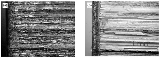 The dissolution role in the formation of a surface layer is also seen from the experiments on the interaction of the (100) surface of a KAP crystal with the RbAP solution (Figure 10) [14]. Crystals were placed into a saturated solution and supercooled by 3.5 °C. In both cases, the formation of a continuous layer was observed, but in the first case, it was formed from an island texture (Figure 10a), whereas in the second, the smooth epitaxial layer was grown (Figure 10b). The wavy surface relief of both samples is caused by the sawing of the crystals perpendicular to the (010) cleavage planes.