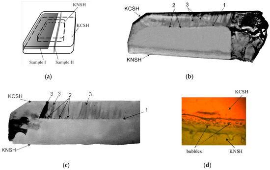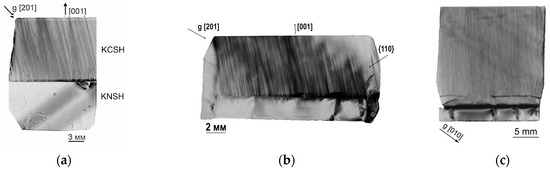Two samples were cut from the grown bicrystal: sample I was cut parallel to the substrate surface, and sample II was cut perpendicular to the substrate surface (Figure 11a). On the X-ray topograph of sample I, there are no images of misfit dislocations at the interface in the sample plane (Figure 11b), while in both samples (Figure 11b,c), on the side interfaces 1, one can see the solution inclusions 2 and dislocation bundles 3, which make a small angle with a normal interface. The dislocation density in the bundles was estimated to be 105–106 cm–2. It should be noted that the dislocation density in KNSH and KCSH crystals is usually of the order of 101–102 cm–2.