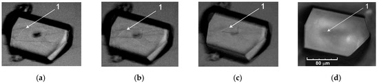 Crystallization of ACSH layers on the ANSH (110) face: (a) 4, (b) 20, (c) 49 and (d) 319 s after coming into contact with the ACSH solution. 1—is a macrostep [26]. Reprinted by permission from Springer Nature Customer Service Centre GmbH: Springer Nature. Crystallography Reports, Formation of Solution Inclusions in Bicrystals of Potassium–Cobalt/Potassium–Nickel and Ammonium–Cobalt/Ammonium–Nickel Sulfates, Grebenev, V.V., Grigor’eva, M.S., Voloshin, A.E. © Pleiades Publishing, Inc., 2010.
