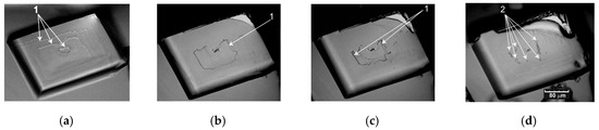 Crystallization of KCSH layers on the KNSH (001) face: (a) 4, (b) 52, (c) 128, and (d) 358 s after coming into contact with the KCSH solution. 1—macrostep, 2—inclusions [26]. Reprinted by permission from Springer Nature Customer Service Centre GmbH: Springer Nature. Crystallography Reports, Growth and properties of mixed K2NixCo1−x(SO4)2·6H2O crystals, Vasilyeva, N.A., Grigoryeva, M.S., Grebenev, V.V., Voloshin, A.E. © Pleiades Publishing, Inc., 2013.