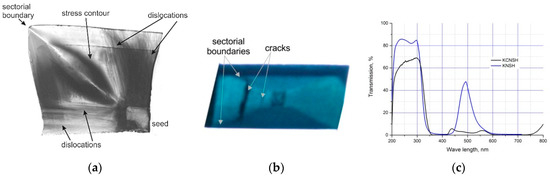 It should be noted that the samples obtained show the same transmittance in the UV region as KNSH crystals (Figure 17c), that is, 12–15% higher than KCNSH crystals grown without feeding [38]. This indicates the absence of scattering centers therein, and therefore, a high level of structural perfection.