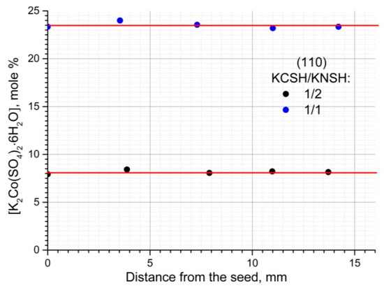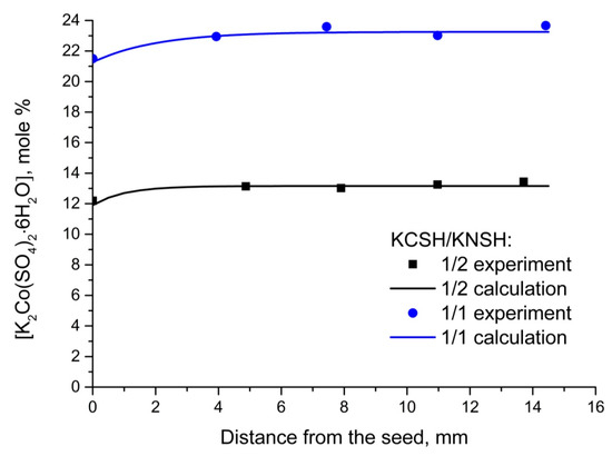 The diffusion coefficients in water for potassium-nickel and potassium-cobalt sulfates are unknown; however, one can determine parameter α from the data presented in Figure 18. The approximation of the experimental data by the curves calculated by the Equation (14) at K0 = 3.7 [42] and K* = 3.3 [37] gives the values α = 1.00 for KCSH:KNSH = 1:2 and α = 0.50 for KCSH:KNSH = 1:1. The crystals with feeding were grown under the same conditions as those whose composition is shown in Figure 18.