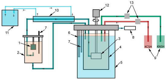 The scheme of the setup for the crystal growth at a controlled temperature difference with maintenance of the solution composition. 1—crystal; 2—crystallizer; 3—submersible centrifugal pump; 4—the vessel with growth solution; 5—thermostat; 6—heating element; 7—the temperature sensor; 8—the peristaltic pump for the condensate extraction; 9—the feeding of the KCSH and KNSH solutions; 10—intermediate cooler; 11—the cooler thermostat; 12—the motor of submersible centrifugal pump; 13—the syringe dispensers [41]. Reprinted from J. of Crystal Growth, vol. 500, Voloshin, A.E., Manomenova, V.L., Rudneva, E.B., Vasilyeva, N.A., Masalov, V.M., Zhokhov, A.A., Emelchenko, G.A. Growth of high-perfect mixed K2NixCo1-x(SO4)2·6H2O crystals for fabrication of high-efficiency UV optical filters, p. 98–103 © 2018 Elsevier B.V.