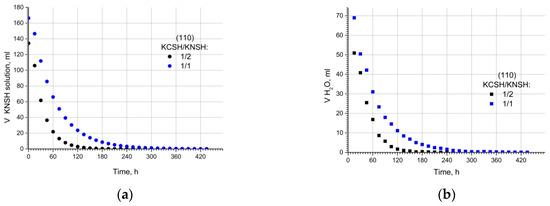 Curves: (a)—feeding by KNSH solutions saturated at 20 °C and (b)—condensate extraction in the non-stationary mode to maintain the constant composition of (110) oriented crystals growing from solutions with the component ratios KCSH:KNSH = 1:2 and KCSH:KNSH = 1:1 [41]. Reprinted from J. of Crystal Growth, vol. 500, Voloshin, A.E., Manomenova, V.L., Rudneva, E.B., Vasilyeva, N.A., Masalov, V.M., Zhokhov, A.A., Emelchenko, G.A. Growth of high-perfect mixed K2NixCo1-x(SO4)2·6H2O crystals for fabrication of high-efficiency UV optical filters, p. 98–103 © 2018 Elsevier B.V.