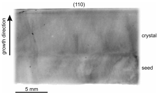 The X-ray topography of the KCNSH crystal grown from KCSH:KNSH = 1:1 solution is shown in Figure 22. It can be seen that there are no inclusions and dislocations at the seed-crystal boundary, and also that there are no areas of kinematic contrast, indicating the absence or an extremely low level of elastic stresses. Previously, inclusions and the dislocations generated by them were observed not only in KCSH/KNSH bicrystals [24], but also in the mixed crystals grown by the temperature difference method in the shapers, but without solution feeding [38].