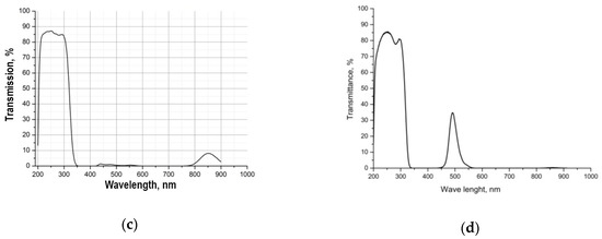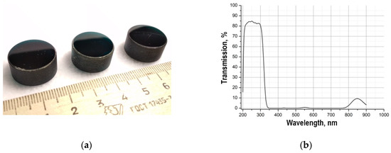 The optical filters with a diameter of 20 mm and a thickness of 10 mm were made from the grown crystals (Figure 23a). Their transmission spectra are shown in Figure 23b,c; for comparison, the transmission spectrum of the optical filter made of NSH crystal is given (Figure 23d). The KCNSH filters have a high transmittance in the UV range (85–87%), i.e., the same as the NSH filter. Also, unlike NSH, they have almost no peaks in the visible range, and in the IR range, peaks do not exceed 10%. The latter circumstance is not a significant drawback, since modern UV detectors are insensitive to radiation with wavelengths above 500 nm. So, all these advantages make possible the successful use of KCNSH crystals as bandpass optical filters.