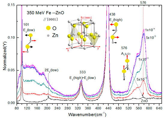 The consequence is that the A1 mode is a vibration parallel to the axis [0001] of the crystal and the polarization orientation is non-degenerate along the axis [0001] direction. Figure 1 shows the propagation direction of incident light along the axis [0001], the scattering strength of E1(y) phonon and the vibrational mode of A1(LO) appeared at 576 cm−1. The E1 mode is the vertical axis [0001] vibration in the XY plane. The scattering strength of A1 phonon is , only when the incident light orientation travel in the vertical z-axis plane and the E1(LO) (588 cm−1) mode is observed. These are confirmed in Figure 2. Therefore, after irradiation, it’s easy to distinguish between A1(LO) and the oxygen vacancy (Vo), which are changing. Both E2(low) and E2(high) modes can be detected simultaneously. This is due to the fact that the E2(low) mode is only associated with the vibration of Zn atoms, while the E2(high) mode is only associated with the vibration of O atoms. All of these are caused by a large number of interstitial oxygen and interstitial zinc atoms after 350 MeV 56Fe21+ ion irradiation. Correspondingly, the absorption band of zinc interstitial (Zni) defects was about 80~245 cm−1, and Vo at 576 cm−1 was detected. The strength of these absorption bands was relevant to the radiation influences of 350 MeV 56Fe21+ ions. This completely demonstrates the vibrational absorption peak at 576 cm−1 after irradiation with 56Fe21+ ions is Vo, rather than the vibration mode of A1(LO).