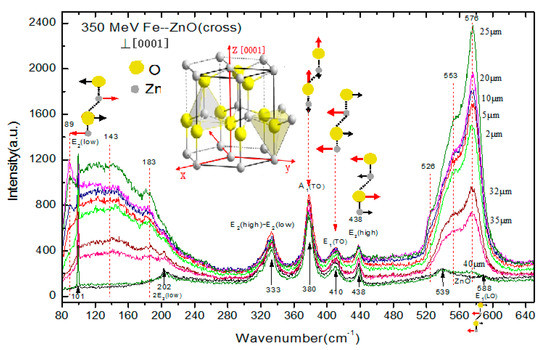 The Raman spectra of 56Fe21+ ion irradiated and unirradiated zinc oxide single crystals are provided in Figure 1. The Raman peaks are shown by the corresponding atomic oscillations in the middle picture of Figure 1, with the red arrows specifying the leading atomic shift direction. The incident light of the Raman laser were directed along the axis [0001] orientation. The eigenmode of E2(low), E2(high) and A1(LO) of unirradiated ZnO samples were located at 101 cm−1, 437 cm−1 and 576 cm−1, respectively. The 2E2(low) and E2(high)-E2(low) modes emerged at 202 cm−1 and 333 cm−1, respectively [13]. After irradiated by 56Fe21+ ions, wide absorption bands of 80 cm−1 ~245 cm−1 and 520 cm−1~600 cm−1 emerged. The 80 cm−1 ~ 245 cm−1 were affected by interstitial zinc () [14,15]. The 520 cm−1~600 cm−1were generated by the oxygen vacancy defect (Vo) [16,17,18]. Since the characteristic vibration peaks associated with oxygen vacancy (Vo) defect at 576 cm−1 completely overlapped with the eigenmode of A1(LO), it was very difficult to confirm whether the strong vibration absorption peaks at 576 cm−1 were caused by A1(LO). According to the analysis of Raman scattering intensity of phonons based on Lattice dynamics theory, when the incident light was perpendicular to the axis [0001] of the crystal for Raman spectrum measurement, the A1(LO) vibration mode did not appear. Figure 2 shows the Raman scattering spectra of the specimen irradiated with 1 × 1014 ions/cm 256Fe21+ ions incident depth at different locations (2, 5, 10, 20, 25, 32, 35 and 40 microns away from the samples surface along the ion incident depth orientation, SRIM calculated that 350 MeV 56Fe21+ ion incident depth in ZnO is about 35 microns) were measured, and the incident light was perpendicular to the axis [0001]. In Figure 2, there is no A1(LO) pattern in the pristine sample shown with the black line. However, a strong peak appeared at 576 cm−1 after 56Fe21+ ion irradiation, which could only indicate that it was the absorption peak of oxygen vacancy (Vo) related defects. The absorption band of 80 cm−1 ~245 cm−1 shows interstitial zinc (Zni) defects, and the absorption band of the defects was obviously enhanced after 56Fe21+ ion irradiation. It may be seen from the figure that the other Raman characteristic lines have no significant variation tendency.