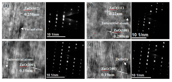 Figure 3 presents a high resolution electron microscope photograph of ZnO irradiated with 1×1014 ions/cm 256Fe21+ ions incident depth at different locations (It is 2, 10, 25 and 32 microns away from the samples surface) along the incident depth orientation of 56Fe21+ ions. As shown, after irradiation, a series of changes took place in the arrangement of atoms, including interstitial atoms, dislocations, vacancies, and other defects.The distances between planes in different directions (002), (200), (111) and (100) were determined by TEM measurement, which were 0.258, 0.19, 0.22 and 0.280 nm, respectively. At the same time, from the corresponding electron diffraction pattern on the right, the diffraction points in the samples were clear and orderly, and no noticeable amorphous phenomena appeared, which indicates that the higher energy (350 MeV) and higher irradiation dose (1 × 1014 ions/cm2) hardly affected the structure and performance of the entire zinc oxide.