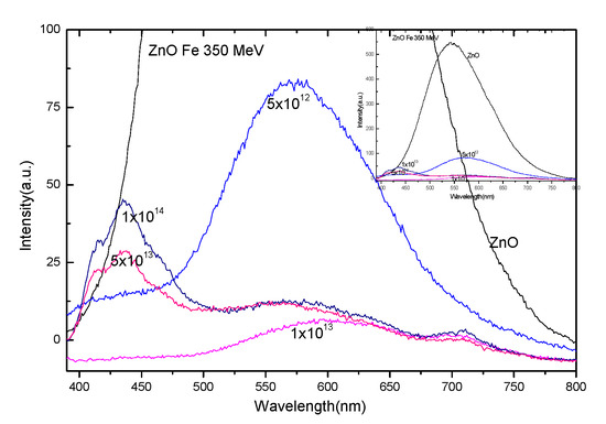 3.3. Photoluminescence Spectra of ZnO Irradiated with 56Fe21+ Ions