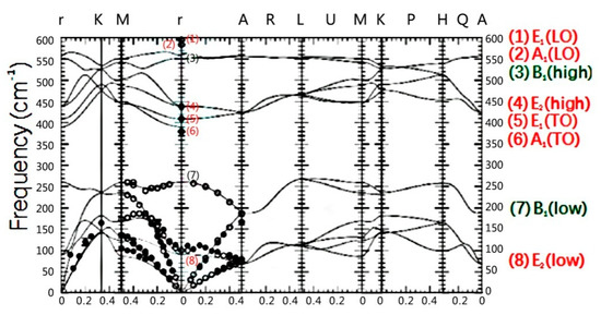 The Raman scattering strength is related to the polarization strength vectors and of the incident and scattered beam, that is, . is a constant, is Raman tensor of phonon . Different Raman spectra may be measured by selecting the appropriate polarization orientation of incident beam. For instance, if we set the polarization strength vectors to , , using the backscatter geometry [23,24]. is the angle between the incident light polarization orientation and the y axis. According to the above formula, it is possible to calculate the scattering strength of A1 phonon, of E1(x), of E2(x), of E1(y) and of E2(y):
