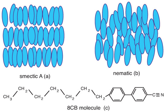 (a) structure of the smectic A phase; (b) structure of the nematic phase; (c) 8CB molecule exhibiting a smectic A phase between 21 and 33.3 °C and a nematic phase above 33.3 °C.