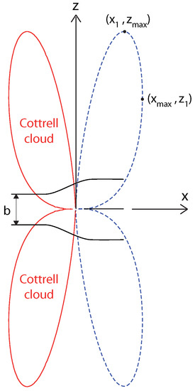 These formulas show that the nanoparticles accumulate inside a Cottrell cloud, the limits of which are defined from the condition (or, equivalently, ). By analogy, an anti-cloud forms in which the concentration is smaller than . This anti-cloud is defined from the condition (or, equivalently, ). The cloud and the anti-cloud are schematically shown in Figure 4. They are composed of four elongated lobes delimited by the points of coordinates and . It can be checked that , , and where – of the order of unity in experiments—is the dimensionless volume change [28]. This shape is very different from the cylindrical shape of the cloud and anti-cloud found in solids. This is due to the fact the elastic stress does not propagate along the layers because of their fluidity, making the smectic A phase elastically very anisotropic.