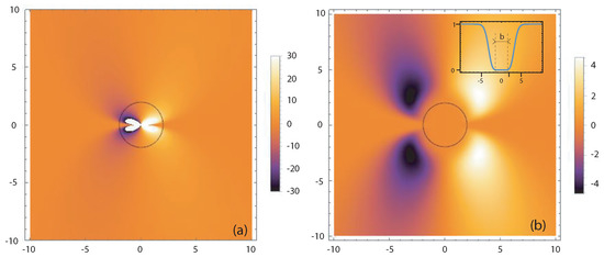 where . This function and the resulting potential are plotted in Figure 5 by taking nm, Pa, nm and nm which are typical values for 8CB at 30 °C [9].