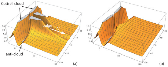 By using this new potential, the concentration field and the resulting drag force were numerically calculated as a function of the dislocation velocity. Two typical 3D plots of the concentration field are shown in Figure 6 when the layers are compressed and v = 0.1 mm/s. In (a), and in (b), . These graphs were calculated by taking m/s [30] and the same values as before for , B, and b. They show that the Cottrell cloud deforms when the dislocation moves. In particular, the nanoparticles accumulate ahead of the dislocation, forming a bulge that is narrow in the z-direction and elongated in the x-direction (it extends over the typical distance ). When , this bulge is strongly pinched along the x-axis (Figure 6a). The bulge strongly flattens and its pinch-off disappears when the nanoparticles can diffuse normal to the layers (Figure 6b). By changing the velocity in the simulations, it can also be shown that both the size of the Cottrell cloud and the concentration inside decrease when the velocity increases, while the number of nanoparticles in the bulge increases and then decreases when the velocity increases, passing through a maximum for a velocity mm/s. This evolution shows that the cloud erodes when the velocity increases. More details about these simulations are given in Ref. [28]. We also refer to this paper for a discussion of the Cottrell cloud evolution when the layers are dilated and the dislocation moves with a negative velocity. In that case, the bulge forms on the side of the Cottrell cloud.