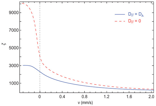 The drag coefficient can also be calculated as a function of velocity. The result is shown in Figure 7 where the graph has been calculated with the same values of the parameters as before. This figure shows that the friction coefficient passes through a maximum for a negative value of the velocity. This asymmetry between positive and negative velocities is due to the fact that the dislocation behavior is different under dilation and under compression. This comes from the fact that, for symmetry reasons, it is different for the dislocation to climb in the positive and negative directions of the x-axis in the presence of a Cottrell cloud. This graph also shows that tends to zero at very large velocity. This is due to the erosion of the Cottrell cloud. The friction coefficient also depends on the ratio , decreasing by a factor of ∼1.5 at small velocities (mm/s) when this ratio passes from 0 to 1. The reader will note that the friction coefficient is not given for large negative velocities. This is not a coincidence. Indeed, these velocities are not accessible experimentally because of an undulation instability of the layers under dilation normal to the layers [33,34].
