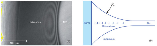 (a) typical appearance in reflecting microscopy of the meniscus formed between a film(on the right) and the frame (on the left). From the interference fringes observed in the thin region of the meniscus, the radius of curvature of the meniscus can be deduced; (b) model of meniscus of radius of curvature filled with dislocations (adapted from Ref. [9]).