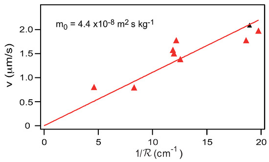 These predictions were tested experimentally and used to determine the mobility m of edge dislocations in 8CB films. The first experiment was performed by using the heating wire technique. In this experiment, only holes of elementary dislocations were analyzed (). It was found that, in thick films, the dislocation velocity measured at radius was inversely proportional to the radius of curvature of the free surface of the meniscus (Figure 10), in agreement with the model. From the slope of this curve, the mobility m of an elementary edge dislocation was deduced: m s kg at 28 °C. A similar experiment was performed more recently with islands obtained by compressing 8CB films with a deformable frame [48]. In this experiment, the dislocations were not elementary, but of Burgers vector (double dislocations). In spite of this difference, the authors found a very similar value for the mobility: m s kg at 27 °C. This observation confirms the predictions of the hydrodynamical model according to which the mobility is independent from b.