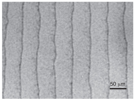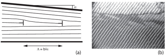 Another method to measure the mobility of an edge dislocation is to study the plastic behavior of homeotropic samples. These samples are made by sandwiching the LC between two glass plates treated for homeotropic anchoring with a silane or a polyimide. With these surface treatments, the LC molecules align normal to the surfaces, resulting in smectic layers parallel to the surfaces. In plasticity, a crucial point concerns the microstructure of the samples. In usual conditions of observation, the dislocations are not visible under the microscope in homeotropic samples. They are nonetheless present, if only because the two glass plates are never perfectly parallel and always make a small angle . Because of this wedge geometry, an array of parallel edge dislocations, separated from each other by a distance , forms to relax the dilatation of the layers due to the thickness variation. These “geometrical” dislocations were observed for the first time by using materials that exhibit a smectic A-to-smectic C phase transition (I recall that in the smectic C phase the molecules are tilted with respect to the normal to the layers). By approaching the phase transition temperature, the dislocations become visible between crossed polarizers, as they locally induce the tilted SmC phase [49,50] (Figure 11). This observation is crucial in plasticity because it shows that the only edge dislocations present in homeotropic samples are the geometrical dislocations. This observation was also confirmed by using a technique based on fluorescence in a lyotropic system [51]. As a consequence, it is enough to measure to know the density of edge dislocations present in each sample. This is a considerable advantage with respect to solids in which the density of dislocations is very difficult to control and this makes the smectic A a perfect candidate to test models of plasticity.