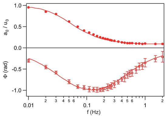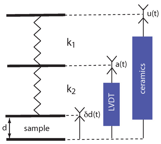 From a mechanical point of view, the rheometer can be modeled by two springs of force constants and in series with the sample (Figure 12). In practice, the displacement is imposed by three stacks of piezoelectric ceramics and the displacement is measured with a linear displacement sensor. The displacements and and their phase shift are measured with a lock-in amplifier when a sinusoidal deformation is imposed to the sample. In this case, and . To fix ideas, nm when a sinusoidal voltage V of 1 Vrms is applied to the ceramics. The rigidity constants and can be measured with Newtonian isotropic liquids of known viscosities (silicon oils for instance).