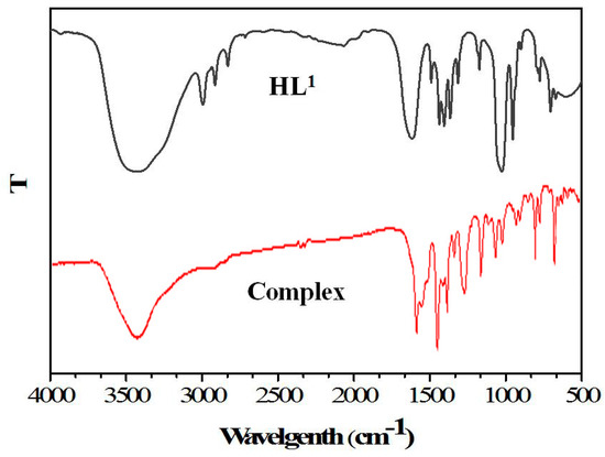In Figure 1, infrared spectra show different bands of HL1 and the Co(II) complex in the range of 500–4000 cm−1. The O–H stretching frequency of HL1 appears at 3443 cm−1, and the peak of the Co(II) complex moves to lower frequency, which occurs at about 3435 cm−1. The O–H stretching vibration is caused by the presence of crystalline methanol molecules in the Co(II) complex. The ligand HL1 shows a characteristic C=N stretching band at 1611 cm−1, while the C=N stretching band of the Co(II) complex appears at 1605 cm−1. At the same time, the free ligand HL1 exhibits an Ar–O stretching frequency at 1181 cm−1, and that of the Co(II) complex appears at 1178 cm−1, and the Ar–O stretching frequency moving to low frequencies, indicating the formations of Co(II)–O bonds.