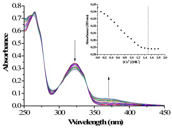 Ultra violet (UV)-Vis spectra of the changes in HL1 upon addition of Co(OAc)2·4H2O (Inset: the absorbance at 320 nm varies with the interaction of [Co2+]/[HL1]).