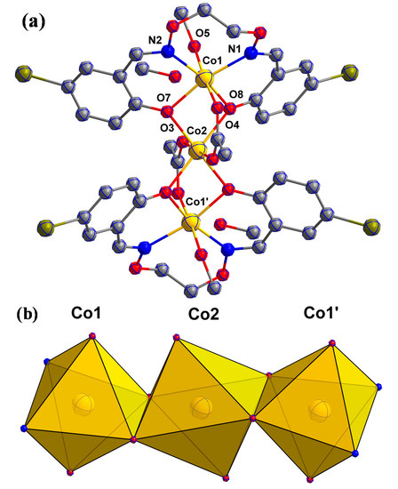 (a) The crystal structure of the Co(II) complex (hydrogen atoms are omitted for clarity, and the atomic symbol only marked the symmetrical part); (b) Coordination polyhedral map of Co(II) atoms.