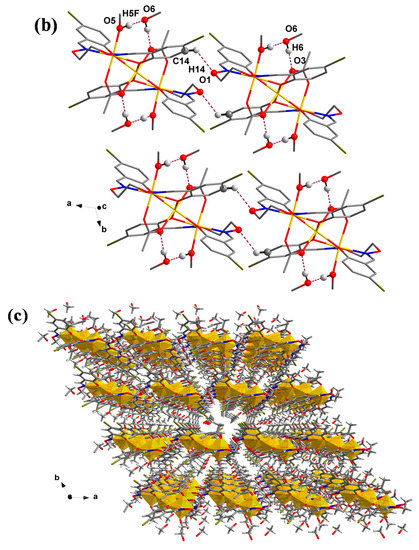 The corresponding hydrogen bonds of the Co(II) complex are summarized in Table 3. As illustrated in Figure 5a, there is one pair of intra-molecular hydrogen bonding interactions (C8–H8···O4) in the Co(II) complex [52], In addition, inter-molecular hydrogen bonding interactions are shown in Figure 5b, and three pairs of intermolecular hydrogen bond interactions were formed in the Co(II) complex, which was O5–H5F···O6, O6–H6···O3 and C14–H14···O1, respectively. Hydrogen bonding interactions play a significant role in the construction of the Co(II) complex. Therefore, an infinite 3-D supramolecular structure is finally formed (Figure 5c).
