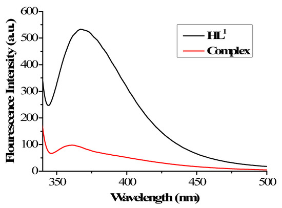 The fluorescent properties of the ligand HL1 and the Co(II) complex in ethanol solvent are shown in Figure 6. The concentration of the ligand HL1 and the Co(II) complex was 5.0 × 10−5 M. At room temperature, at 320 nm excitation, the free ligand HL1 shows a relatively strong emission peak at 367 nm and should be assigned to the ligand π–π* transition. Compared with the free ligand HL1, a weak fluorescence intensity at 360 nm was observed in the Co(II) complex, indicating that the fluorescence characteristics were affected by the introduction of Co(II) ions, as a result, the fluorescence intensity gradually weakens during the process from the ligand HL1 to the Co(II) complex. These transitions may be related to the coordination of the ligand HL1 and the Co(II) ions, which allows the ligand to develop towards a more stable complex.
