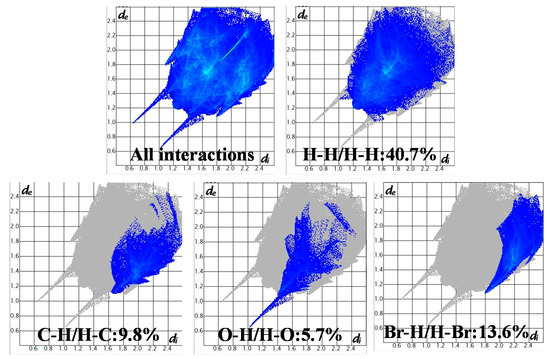 The short-range interaction distribution inside the Co(II) complex was calculated by Hirshfeld fingerprint plot to quantify the intermolecular interaction. The 2-D fingerprint is summarized in Figure 8. As shown in the figure, for each molecule of the Co(II) complex, the proportion of C–H/H–C, O–H/H–O, H–H/H–H and Br–H/H–Br interactions was 9.8%, 5.7%, 40.7% and 13.6% of the total Hirshfeld surface, respectively. It is apparent that the intermolecular interactions of the total surface of Hirshfeld are mainly derived from the H–H/H–H interaction.