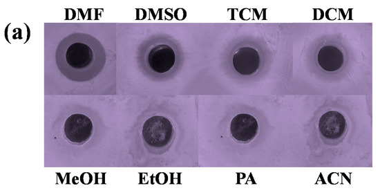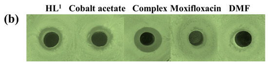 The antibacterial activities of HL1, cobalt(II) acetate tetrahydrates and the Co(II) complex were tested by perforation method, and Gram-negative Escherichia coli was selected as the research object. First, the Co(II) complex is formulated into a solution of the same concentration using different solvents (DMF, DMSO, TCM, DCM, MeOH, EtOH, PA, ACN), and secondly, when culturing E. coli to OD600 ≈ 1.0 using LB liquid medium (2% agar), add 25 μL to LB solid medium at about 50 °C, pour the plate to solidify, and punch with a puncher. A sample of 200 μL of different solvent was added to each well and placed in an LRH-250-G light incubator at 37 °C for 12 h to observe the size of the zone of inhibition. As shown in Figure 9a, only the DMF has a larger diameter of the inhibition ring than other solvents, indicating that the complex has relatively strong antibacterial activity in the presence of DMF.