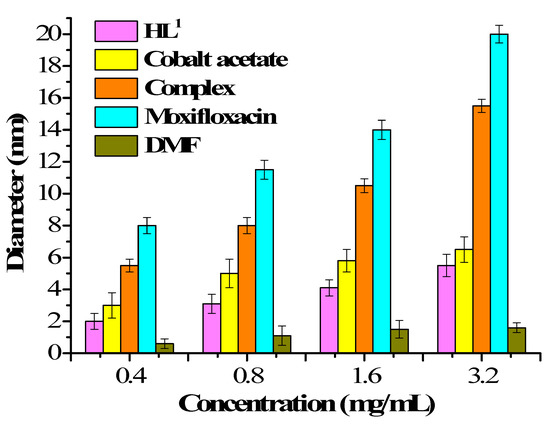 Four groups of solutions were prepared by DMF solution at concentrations of 0.4 mg/mL, 0.8 mg/mL, 1.6 mg/mL, and 3.2 mg/mL, respectively. Under the same conditions, using moxifloxacin as a positive control experiment, 200 μL of the sample was added to the LB solid medium, and all the samples were incubated at a constant temperature of 32 °C for 12 h, and Figure 9b is a zone of inhibition of a different sample at a concentration of 3.2 mg/mL, we can clearly see that the diameter of the inhibition zone of HL1, cobalt acetate, the Co(II) complex and moxifloxacin increased sequentially. From the results of Figure 10, it can be shown that the Co(II) complex has stronger antibacterial activity than the ligand, and the antibacterial activity increases as the concentration increases.