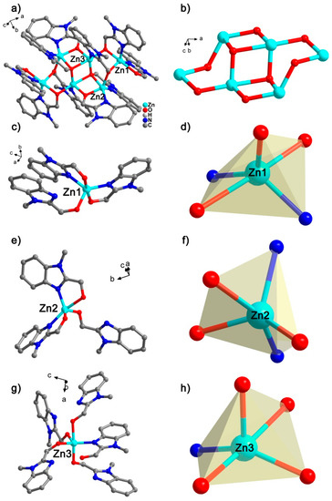 (a) Crystal structure of complex Zn6; (b) cluster nucleus Zn6O8 structure, where all H, C, and N atoms are omitted for clarity; coordination environment (c,e,g) and coordination configuration (d,f,h) of Zn1, Zn2, and Zn3.