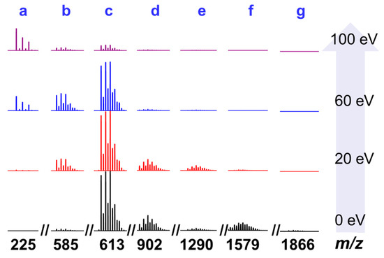 High resolution electrospray mass spectrometry (HRESI-MS) fragment (cationic mode) of cluster Zn6 at different ion source energies (0~100 eV).