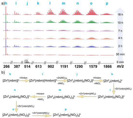 (a) The time-dependent HRESI-MS of the Zn6 formation process at different time periods (for clarity, the fragments l → p were amplified by a factor of five); (b) Schematic diagram of the gradual assembly mechanism of cluster Zn6 with time.