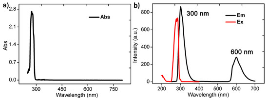 UV–Visible absorption spectroscopy (a) and photoluminescence spectrum (b) of the cluster Zn6 dissolved in N,N-dimethylformamide (DMF) at room temperature.